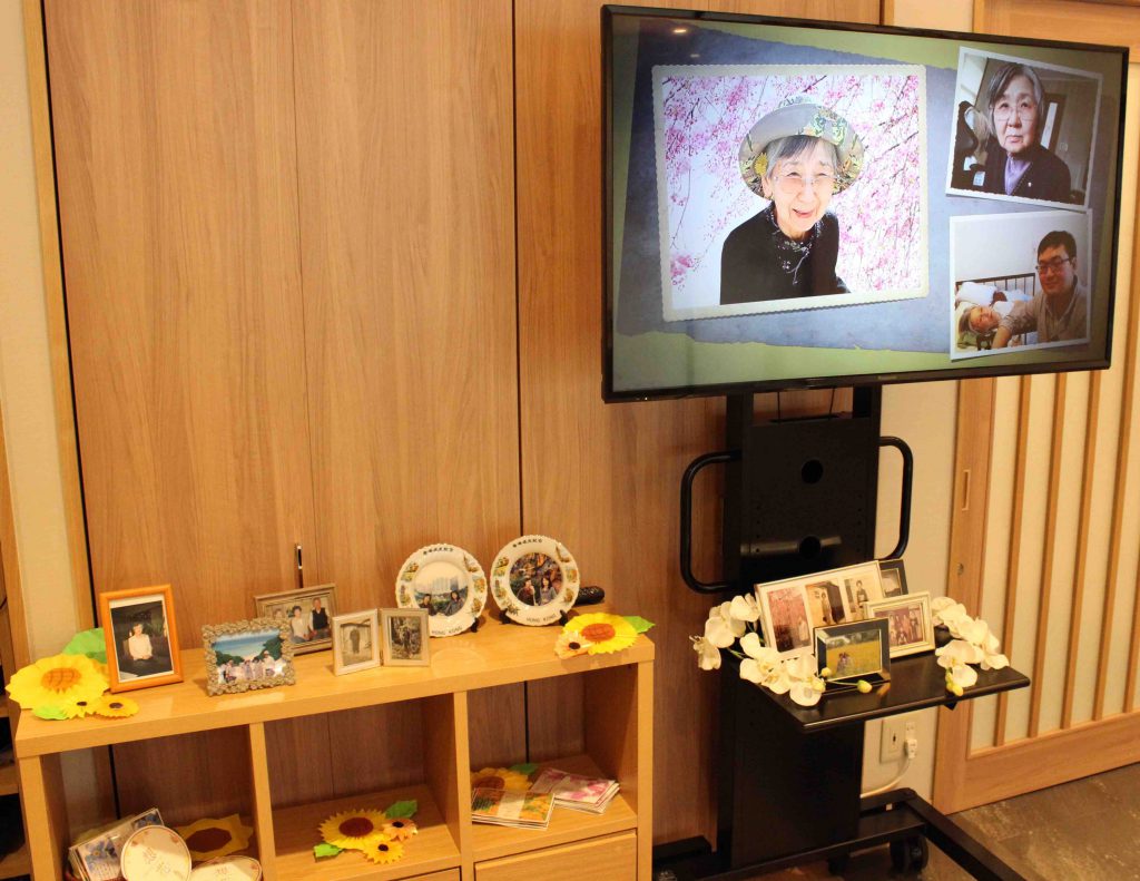 最後まで故人様に寄り添っておられたお孫様とのお写真等で作成させて頂いたスライドショーとともに故人様への愛情が沢山詰まったメモリアルコーナーになりました。