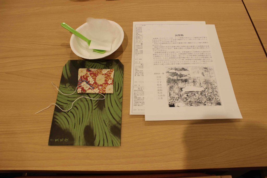 今回のお香教室は、新年の玄関に吊るす魔除けの匂い袋、訶梨勒(カリロク)という匂い袋と文香をつくりました。