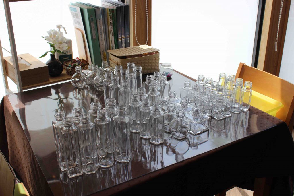 ハーバリウムを作るためには、様々な形のガラスボトルからお気に入りの瓶を決め、ボトルに入れる花材や飾り素材を選んで飾っていきます。