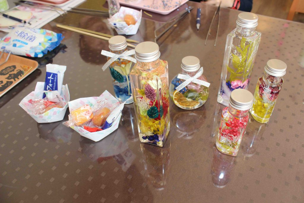 体験教室の楽しみは、初めてお会いする人でも和気あいあいとおしゃべりしながら作品が作っていけることです。また、ハーバリウムは同じものを作るのが難しく、一つ一つ違う作品が出来上がるのも楽しみの一つです。