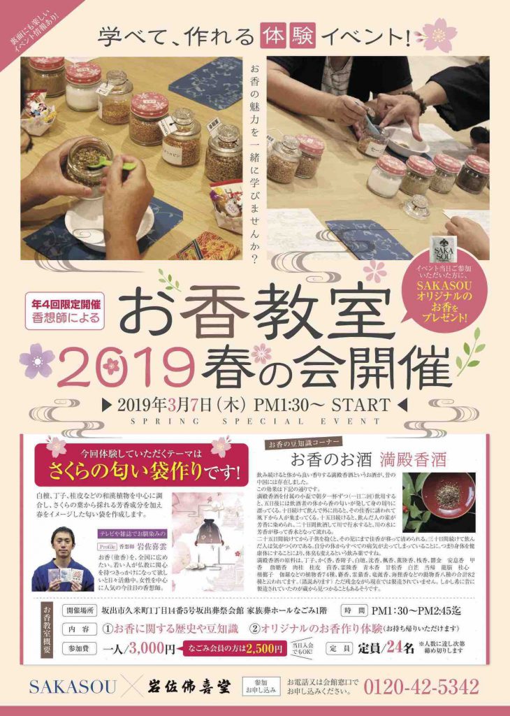 今回のお香教室の内容は、まさに春にぴったり!!桜の香りの匂い袋作り体験です。