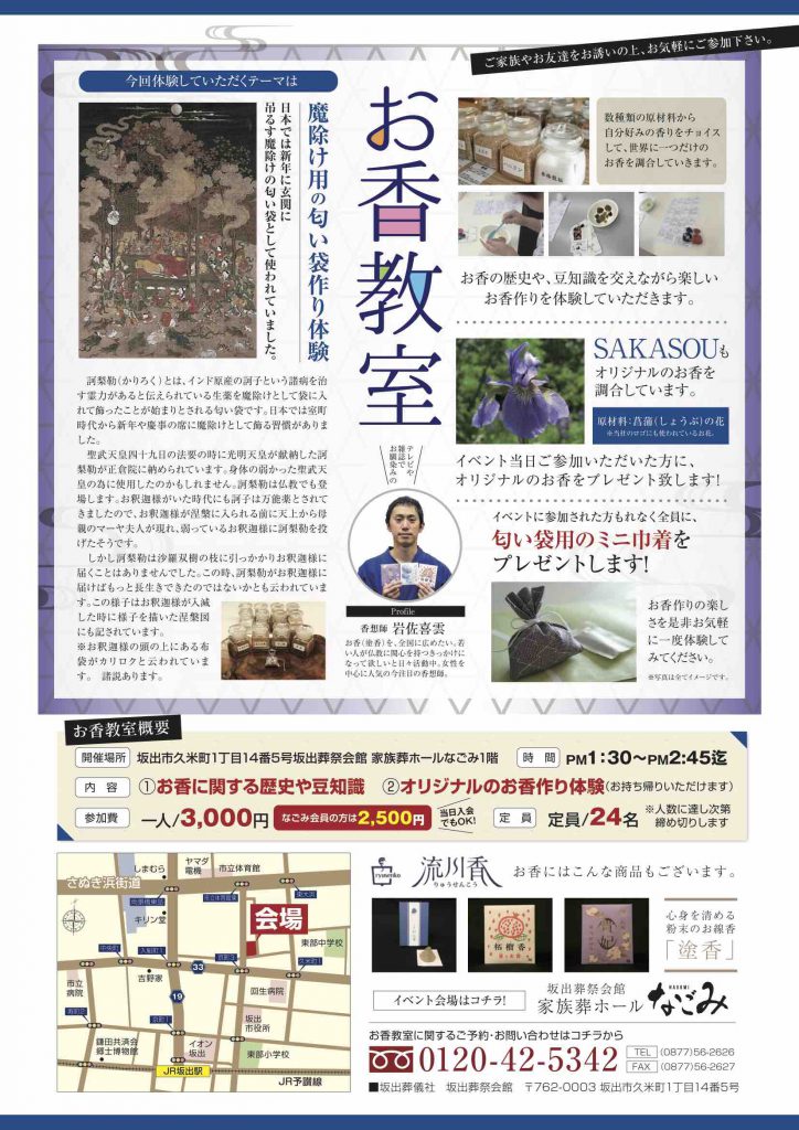 毎回内容を変えて開催しているお香教室ですが、魔除けのお香はどんな香りがするのでしょうか。わたしも今から楽しみです♪