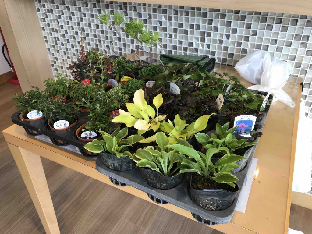 今回の体験は欅、松、大文字草、斑入り白鳥花、ピラカンサスなど様々な種類の苗木からそれぞれ好きなものを選び苔玉をつくっていきました。