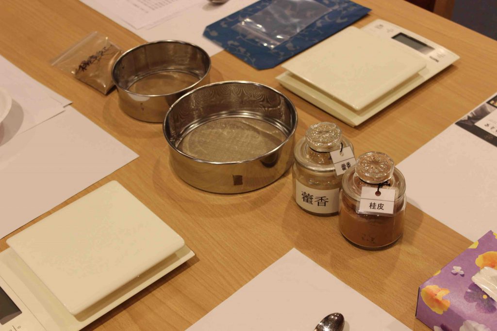 白檀、丁子、桂皮、桜の葉から取れる成分などを合わせて春らしい香りをつくれる体験教室。