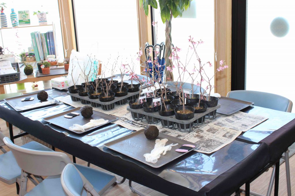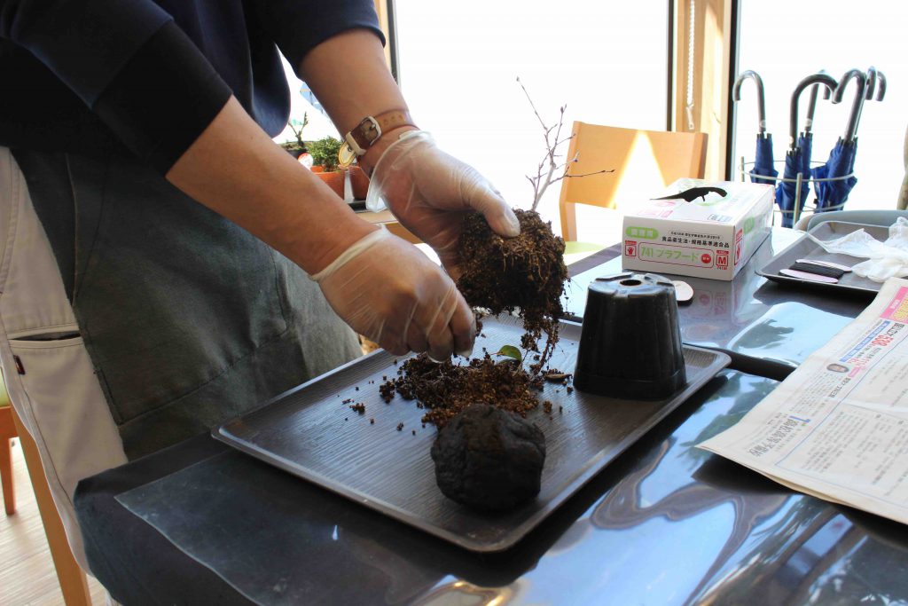 自分で好きな桜の苗を選んで土をほぐし余分な根をちぎり土台の完成。