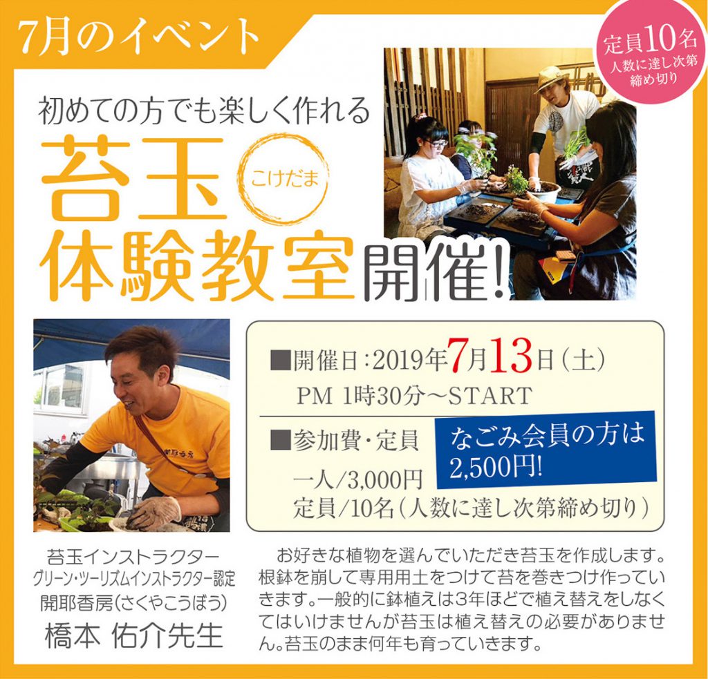 7月のSAKASOU体験教室は開耶香房の橋本佑介先生をお招きして『苔玉づくり』を予定しております。