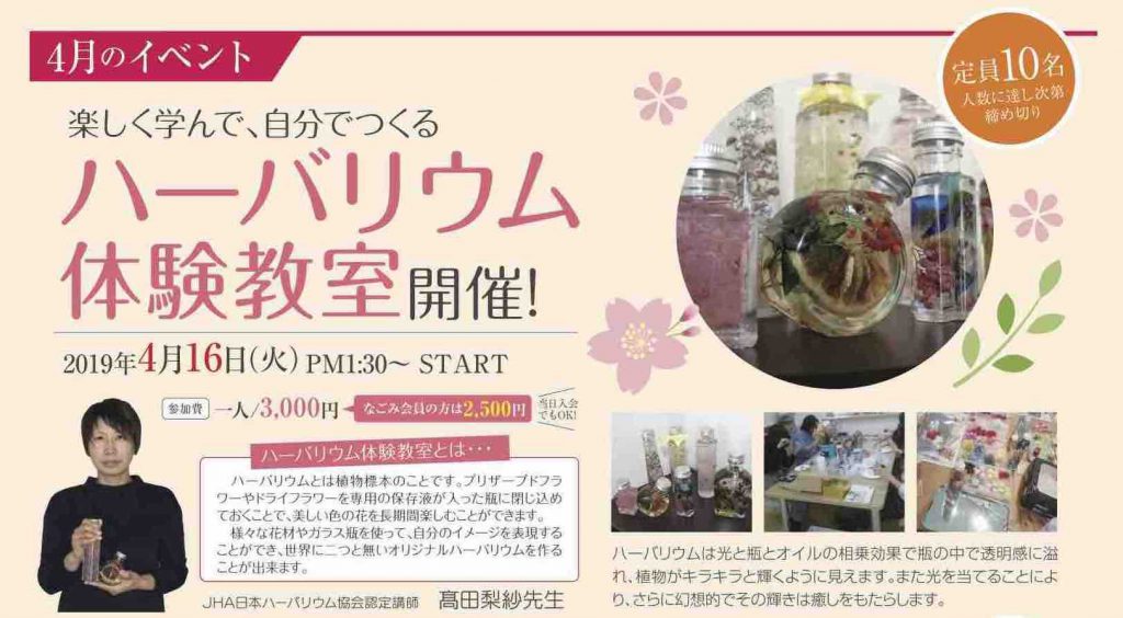 JHA日本ハーバリウム認定講師 髙田梨紗先生をお招きしハーバリウム体験教室を開催させていただきます。