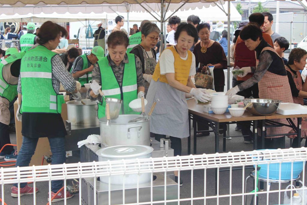 館外においては、地域防災協定を結んでおります久米町西連合防災協会さまのうどん炊き出しをはじめ、会員限定での焼きそば、かしわめし等の無料販売を行いました。こちらも無料販売分はほぼ完売と大変ご好評をいただきました。