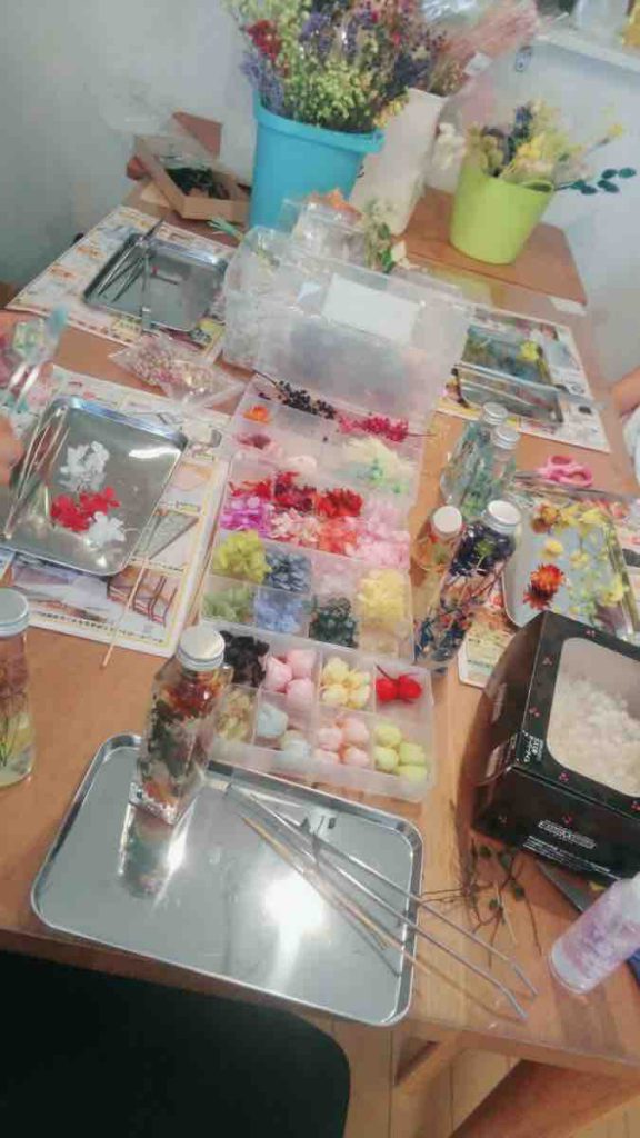 体験教室の楽しみは、初めてお会いする人でも和気あいあいとおしゃべりしながら作品が作っていけることです。また、ハーバリウムは同じものを作るのが難しく、一つ一つ違う作品が出来上がるのも楽しみの一つです。