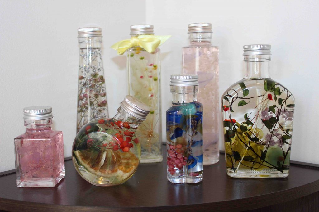 ハーバリウムを作るためには、様々な形のガラスボトルからお気に入りの瓶を決め、ボトルに入れる花材や飾り素材を選んで飾っていきます。