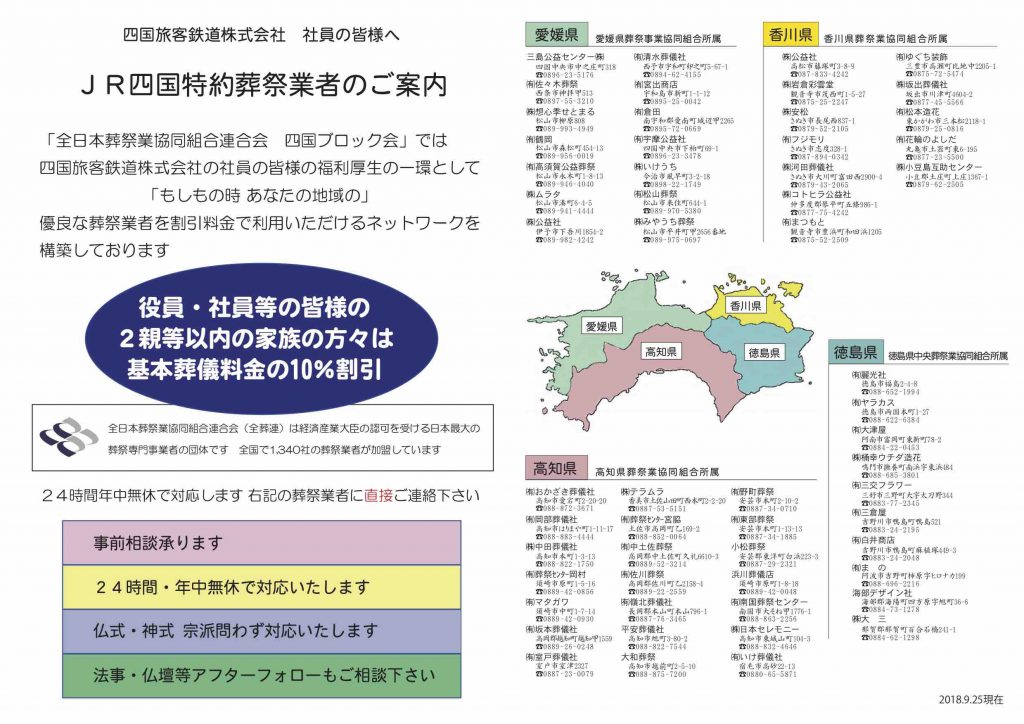 四国旅客鉄道株式会社の社員の皆様の福利厚生の一環として 「もしもの時 あなたの地域の」 優良な葬祭業者を割引料金で利用いただけるネットワークに加盟しています。