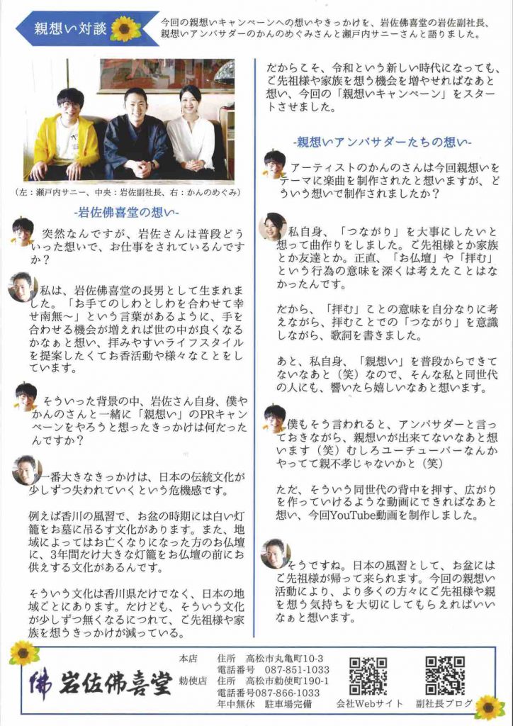 SAKASOUフリーペーパーのコラムやお香教室で、お馴染みの岩佐佛喜堂さん主催の『親想いキャンペーン』を見学に行きました。