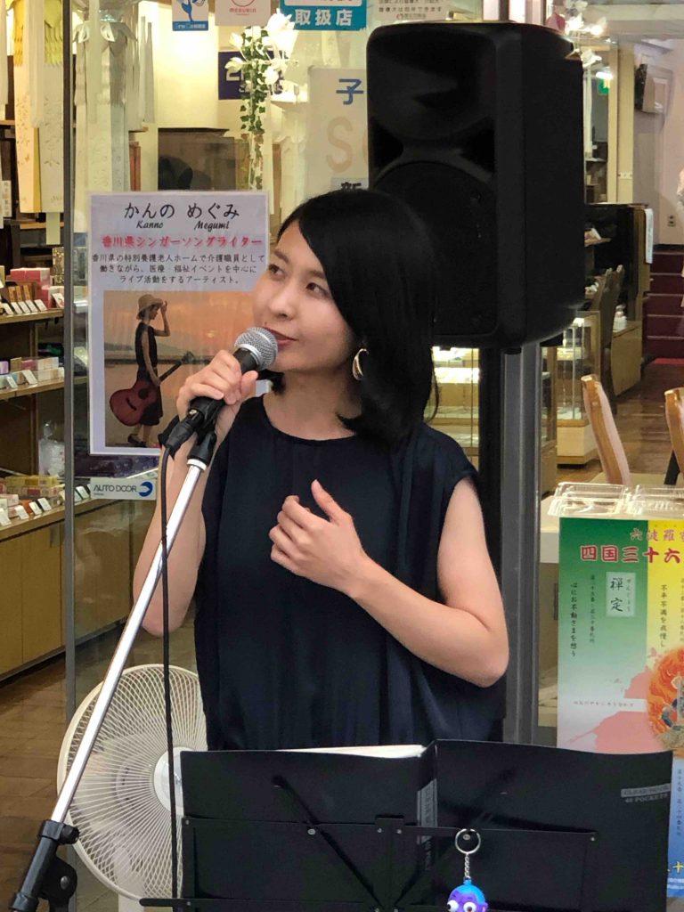 また、岩佐佛喜堂本店前では「かんのめぐみ」さんが『親想い』をテーマにした楽曲「心合歌」を披露されていました。