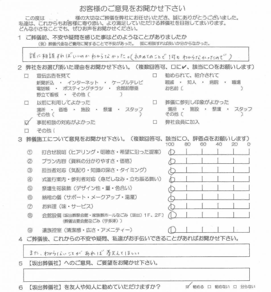 その後、ご葬儀が終わった後に『事前相談に来てお話しを聞いていて良かった。何も知らないまま葬儀をするのは凄く不安だった。準備しないといけない事、しないといけない事が細かいところまでよく分かった。』と、仰っていました。