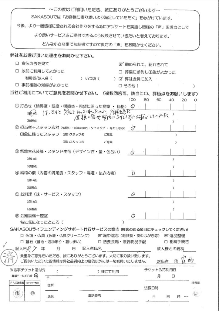 特に費用面については、不安が残らないよう分かりやすくご説明し、すぐに対応したことに対して「信用、安心できた」とのお言葉を頂戴しました。