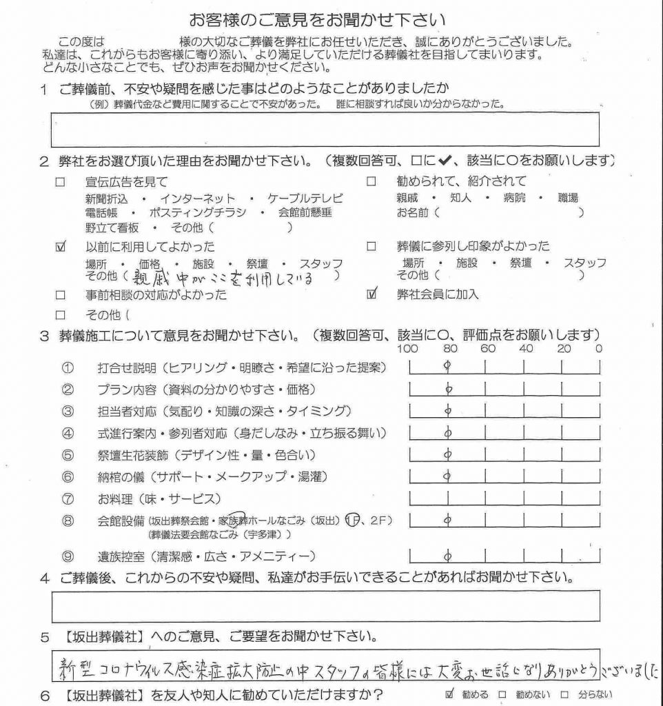 新型コロナウイルスは、ご葬儀にも影響を与えています。近しい方が亡くなり心身共に疲弊するなか、「ご葬儀を行う事が心配です」と声を聞く事がございます。私たち坂出葬儀社は、少しでもご遺族様に安心をお届けする為に9つの取り組みを実施しております。取り組みの中には、お客様にお願い申し上げる事もございますが、お客様の安全を第一に考え緊急事態宣言が解除された、今だからこそより一層、新型コロナウイルス感染症拡大防止の為に坂出葬儀社のスタッフは日々出来る事を考え業務に尽力致します。